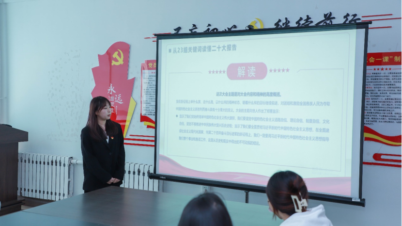 会议伊始,林欣怡同学从大会的主题、新时代十年的伟大变革、三件大事、马克思主义中国化时代化新境界等二十三组关键词带领同学们读懂二十大报告。