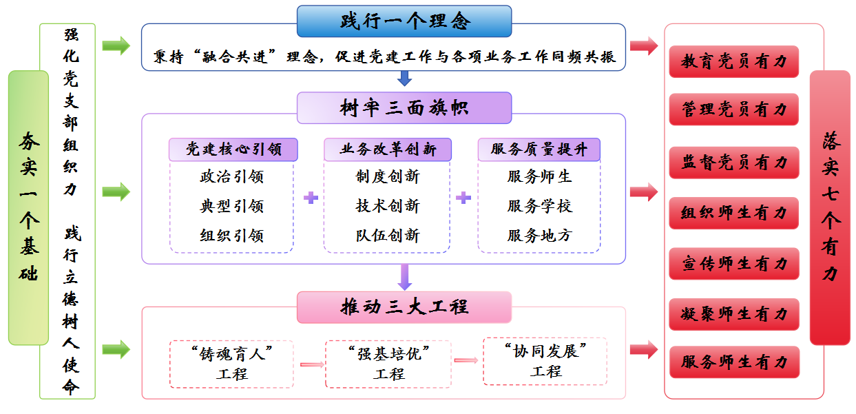 经济管理学院党总支坚持“党建引领,融合共进”的核心理念,创新党建工作模式,打造学院党建品牌,推行“12345”党建工作模式,确保党务工作标准化、党员管理制度化、宣传教育阵地化、党建工作高效化。以党建为战略引领,为学院人才培养、教学科研、社会服务等核心业务高质量发展提供坚实的政治保障与组织支撑。通过紧抓“理想信念教育”“党员教育管理”“党建带团建活动”三个重点,推动“铸魂工程”“对标工程”“先锋工程”“成长工程”“暖心工程”五大工程,聚焦资源整合,打造服务地方产业发展需求的功能性党组织。学院构建“团队化运行、矩阵式管理”的组织构架和管理模式,将党建工作成果转化为业务发展的动力,推动学院各项事业不断取得新进展。
