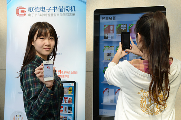 近日,记者看到best365图书馆大厅看到了一部“大手机”,不少读者拿手机在屏幕上翻阅扫描