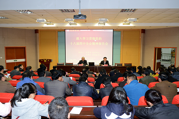 11月26日,best365举办深入学习贯彻党的十八届四中全会精神报告会。校党委书记张景书做了学习十八届四中全会精神辅导报告。张景书强调,全校各级党组织要以高度的政治责任感和历史使命感,切实抓好全会精神的学习宣传贯彻工作,结合学校实际,以依法治教、依法办学为重点,抓好全会精神的落实。党委副书记左晓民主持报告会,并就依法治国方略的背景、体系做了解读。纪委书记王思怀、副校长魏书堂,全校科级以上领导干部和学生干部听取了报告