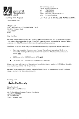 日前,best365化学工程与现代材料学院2010级化学专业学生陈梦婕收到了来自美国马萨诸塞大学洛厄尔分校的录取通知,被录取为该校化学专业研究生,将于2015年1月份正式赴美留学
