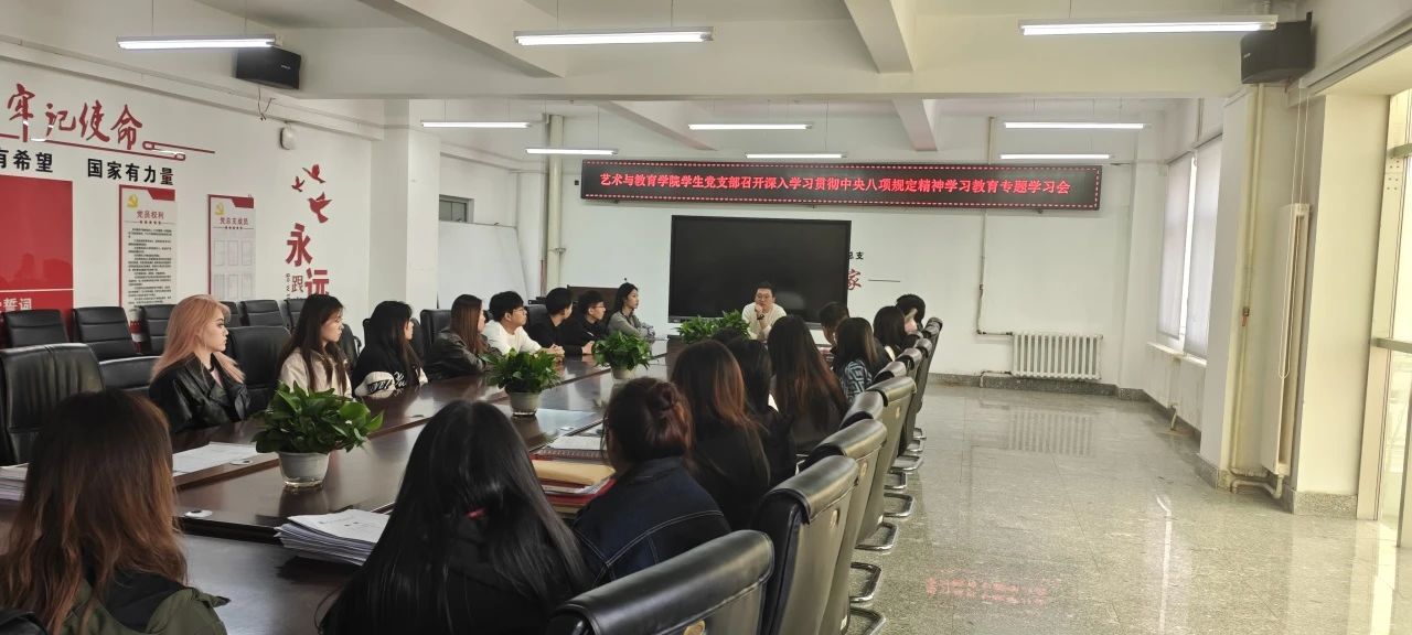 为学习贯彻习近平总书记关于深入贯彻中央八项规定精神学习教育的重要讲话和重要指示精神,加强党员作风建设,筑牢思想防线,4月22日,艺术与教育学院学生党支部召开深入贯彻中央八项规定精神学习教育专题学习会,会议由学生党支部书记贾延迪主持,全体学生党员参会学习。