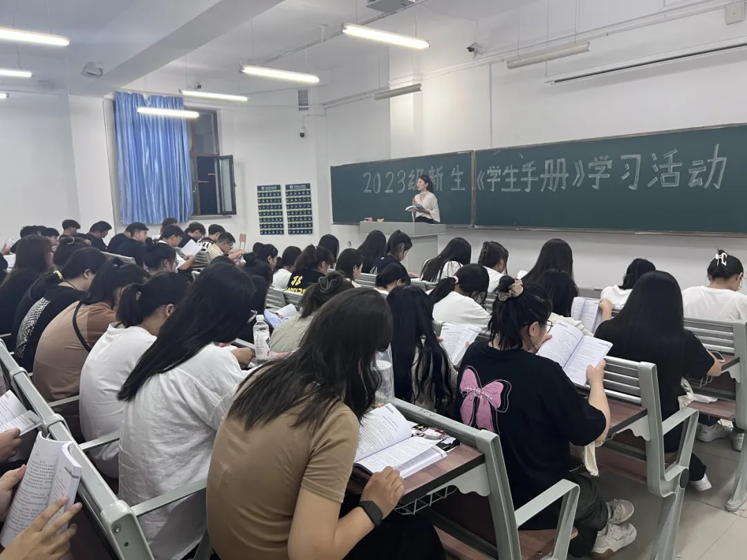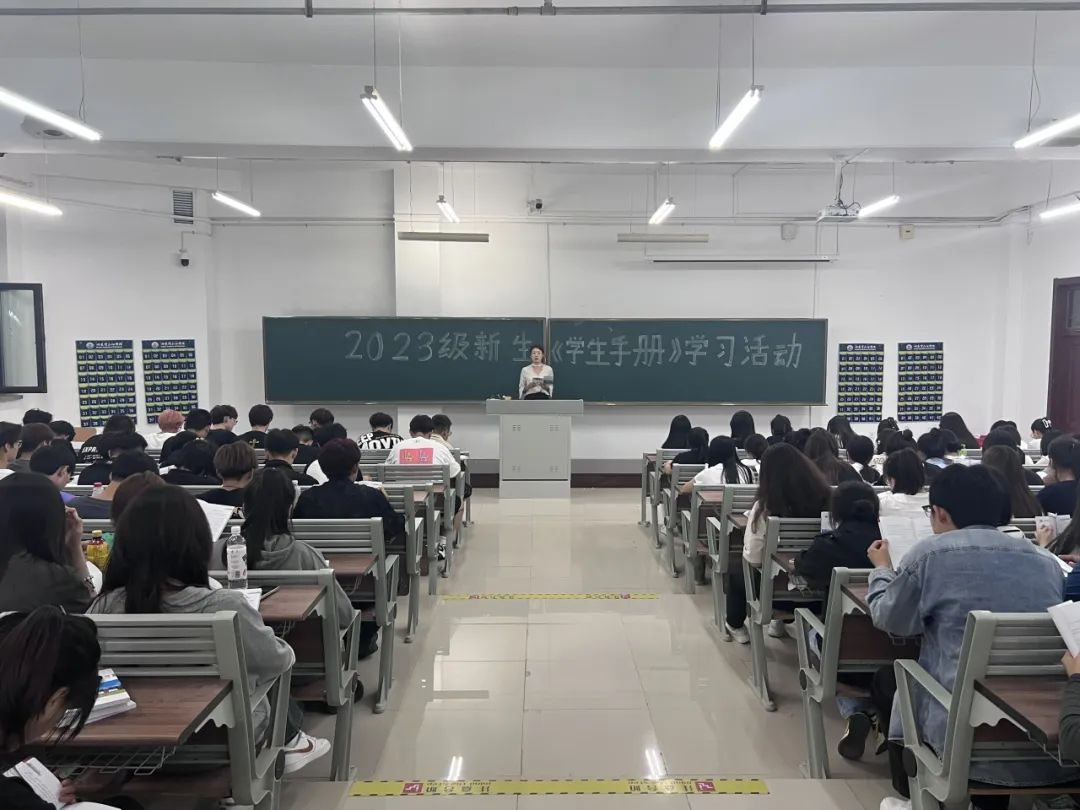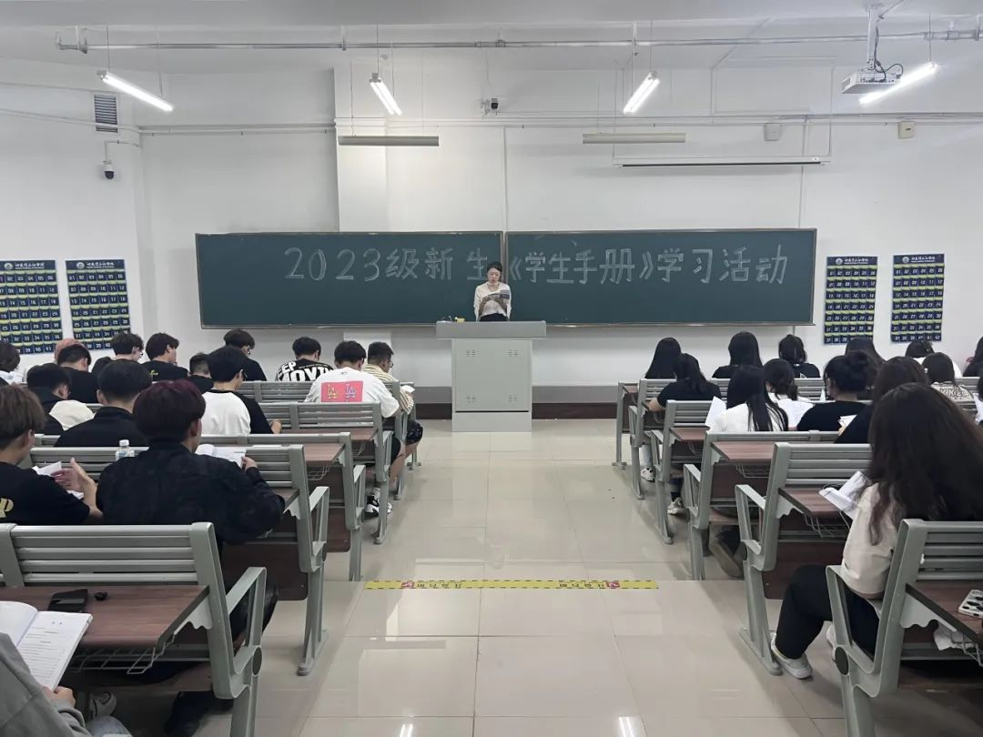 为进一步加强我院2023级新生对学校各项规章制度的了解,促进广大学生对学校各项规章制度的进一步学习,加强学生校规校纪教育,掌握学校关于学生的管理规定。艺术与教育学院于2023年9月3日于第一教学楼332组织2023级全体新生学习《金沙检测线路js69学生手册》,本次活动由2023级新生辅导员王昱主持,2023级全体新生参加。