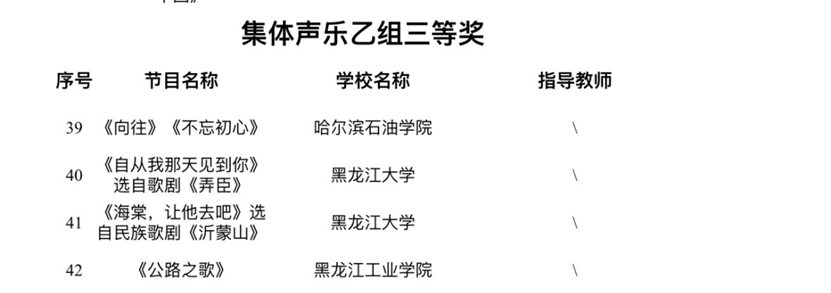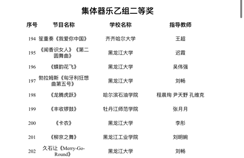 据了解,本次活动是由黑龙江省教育厅主办,黑龙江日报报业集团承办,是省内最高级别的大学生艺术类赛事。该项赛事由于四年举办一届,所以无论从作品质量还是竞赛规模都代表省内大学生艺术表演类作品的最高水准。本届赛事,艺术与教育学院取得不俗成绩。在集体组赛道,由音乐表演专业教师程晨珣、尹天野、孔维克指导的群鼓作品《龙腾虎跃》获得集体器乐乙组二等奖,由音乐表演专业教师李丹、于冬梅、王悦、王佳男指导的大合唱《向往》和《不忘初心》获得大赛集体声乐乙组三等奖。在个人表演赛道,青年教师尹天野指导的作品《筵》获得个人器乐乙组一等奖,教师刘振红古筝作品《莲花谣》获得个人器乐乙组二等奖,教师商俊声指导声乐作品《就在山水间》获得个人声乐乙组二等奖,音乐表演系主任孙玉明与青年教师刘行合作指导作品《跟你走》获得个人声乐乙组三等奖,外聘教师王磊指导的流行音乐作品《拆穿》获得本次展演的个人声乐乙组三等奖。同时,由多名音乐表演专业师生参与的学校大型话剧《铁人颂》获得本次大赛集体戏剧乙组一等奖。