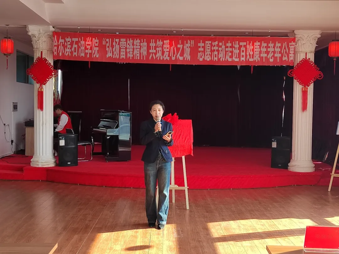 授牌仪式上,百姓康年老年公寓副院长张丽波向代表参加仪式的学院领导和青年志愿者们详细地介绍了青年志愿服务基地的基本情况,并对下一阶段志愿服务工作的开展思路作了分享。她表示会努力为我院开展志愿服务活动提供相应的支持和帮助。随后,艺术与教育学院党总支书记刘强发言,首先,他代表艺术与教育学院对百姓康年老年公寓对我院青年志愿服务活动的大力支持和帮助表示由衷地感谢,并强调了实践基地是雷锋精神的传递与志愿服务精神的延续,也是我院学子们深入了解社会、融入社会、服务社会、奉献社会的平台,希望同学们依托于基地,在这里为老人们提供细致入微的志愿服务,充分地展现新时代青年的良好风貌。最后,我院青年志愿者协会负责人张月对百姓康年老年公寓全体工作人员表达感谢,并表示会不断地用实际行动诠释志愿服务精神,传递乐于奉献的美好品质,续写新时代雷锋故事的崭新篇章。挂牌仪式结束后,志愿者们为老人们带来了精彩的文艺演出同他们一起度过了温馨快乐的时光。