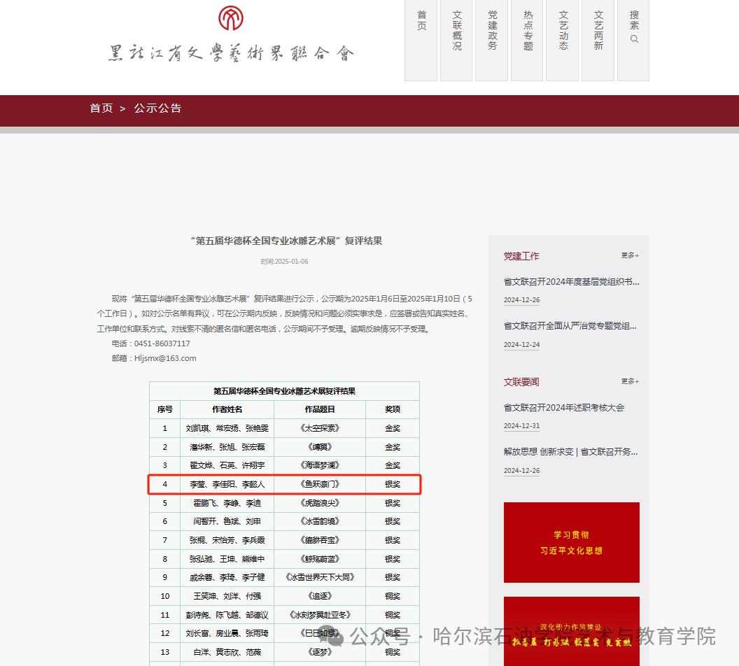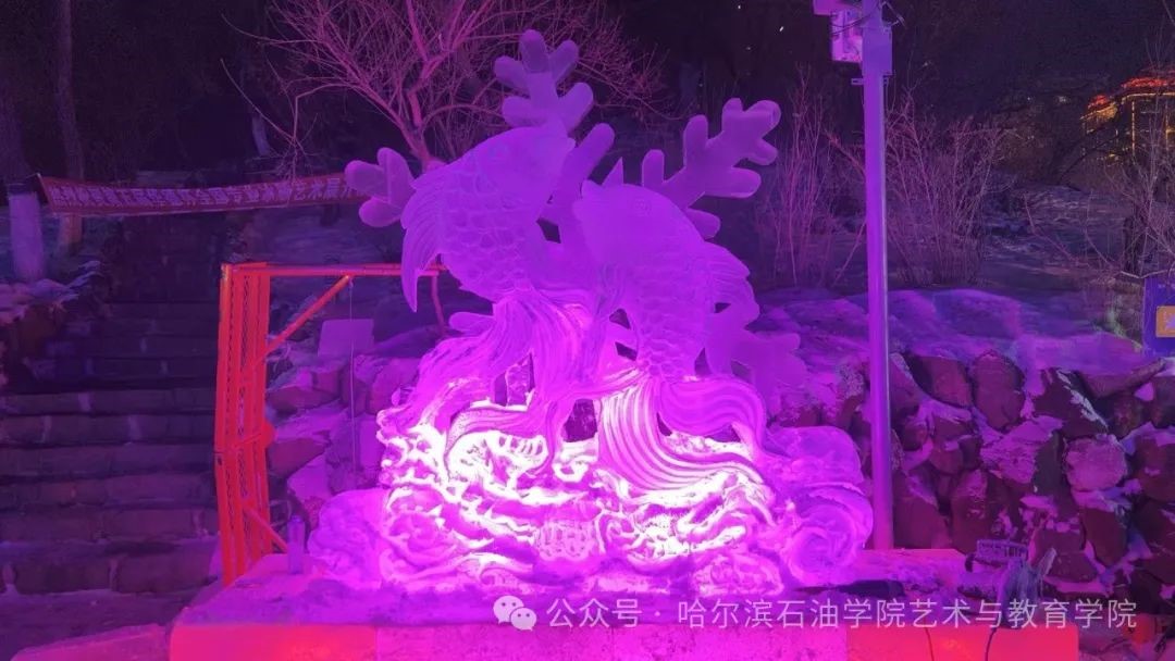我院数字媒体艺术系主任李莹、教师李懿人与智能工程学院工业系主任李佳阳共同完成冰雕作品《鱼跃凛门》荣获全国专业冰雕艺术展银奖。