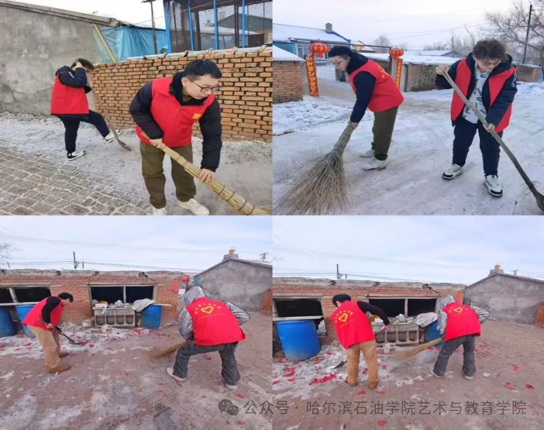 为迎接新春佳节的到来实践团成员拿起扫帚、铁锹等工具,与村民们一起清扫道路积雪和垃圾。大家不畏严寒,干劲十足,用实际行动为村民营造干净整洁的生活环境。