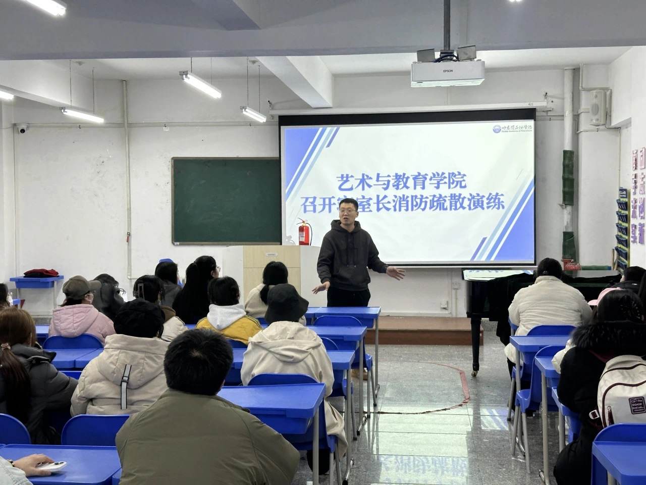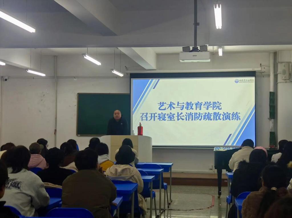 为了进一步加强学院宿舍建设管理工作,推进落实寝室长安全责任制,营造安全、文明、和谐的生活环境,2025年3月27日,艺术与教育学院在艺术楼406教室开展寝室长消防疏散演练培训会,培训会邀请校保卫处王炳旭老师作为主讲嘉宾,会议由贾延迪老师主持,各年级寝室长参加。