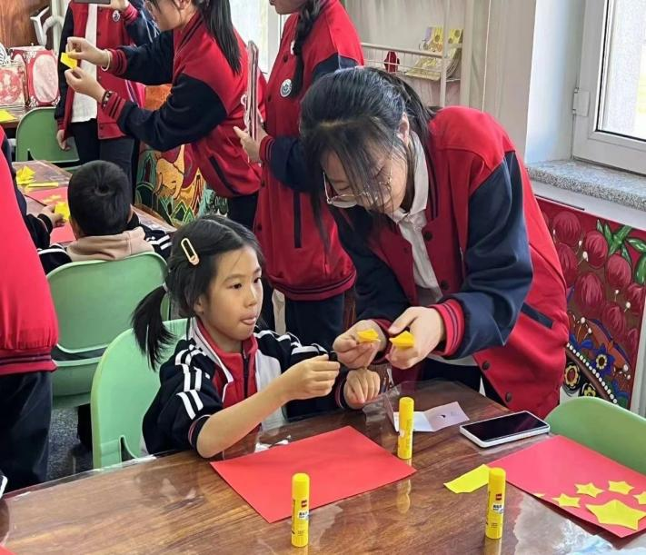 美工组成员在刘雪老师和王汝慈老师的带领下,由2021级小老师们教授小学生们动手制作“五星红旗”,并和自己的作品拍照合影,通过本次活动,让小学生们了解国旗的由来,进行了一次生动的爱国主义教育。