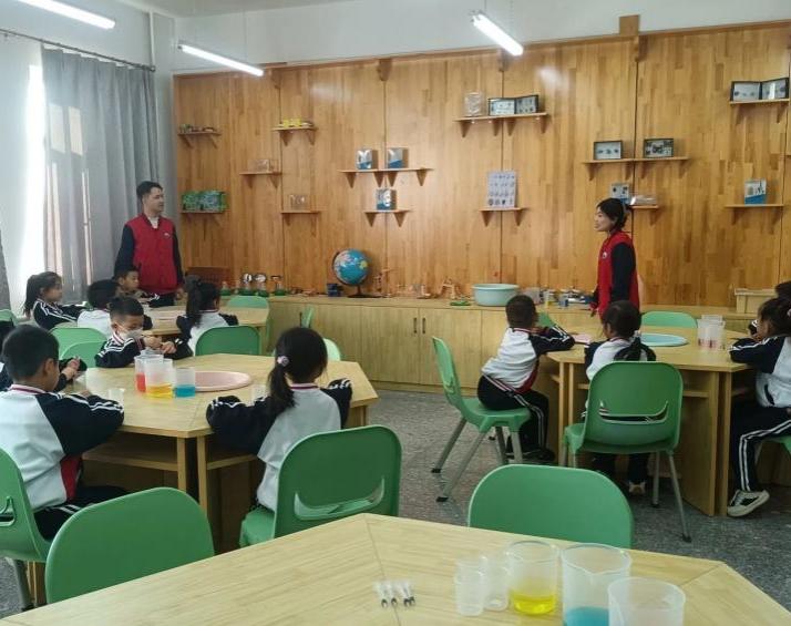 科学实验小课堂组成员在姜薇和黄煊惟老师的带领下,由2021级小老师们组织开展《颜色变变变》小实验,激发小学生们的好奇心和探索欲,让他们在自由探索的过程中了解颜色的变化和混合,同时培养其想象力和创造力。
