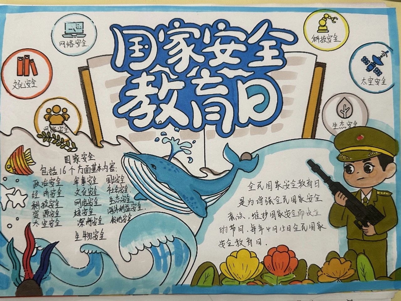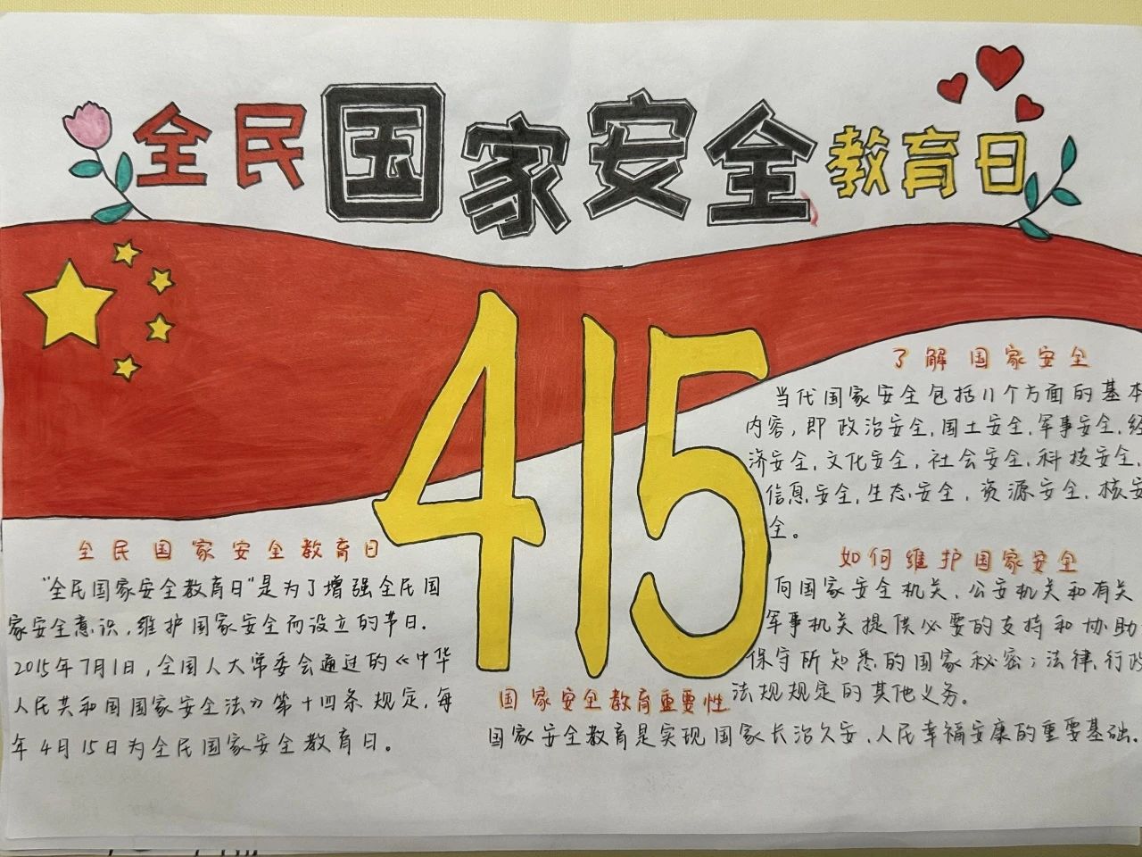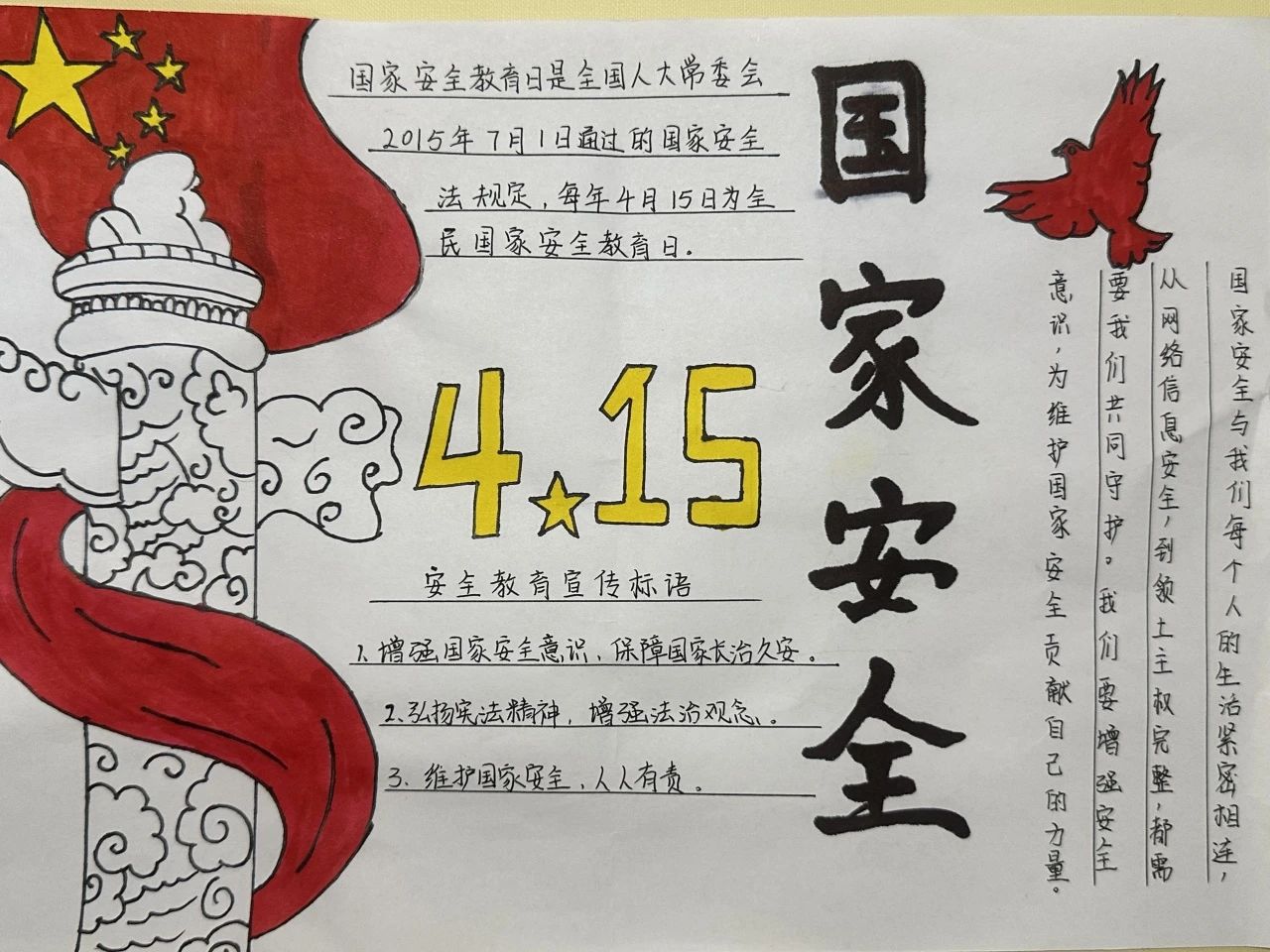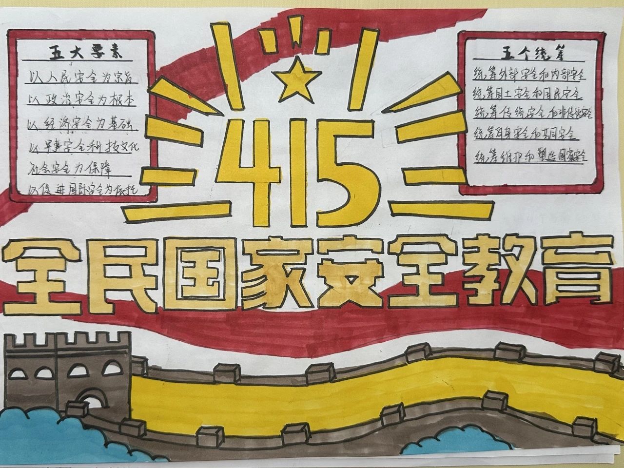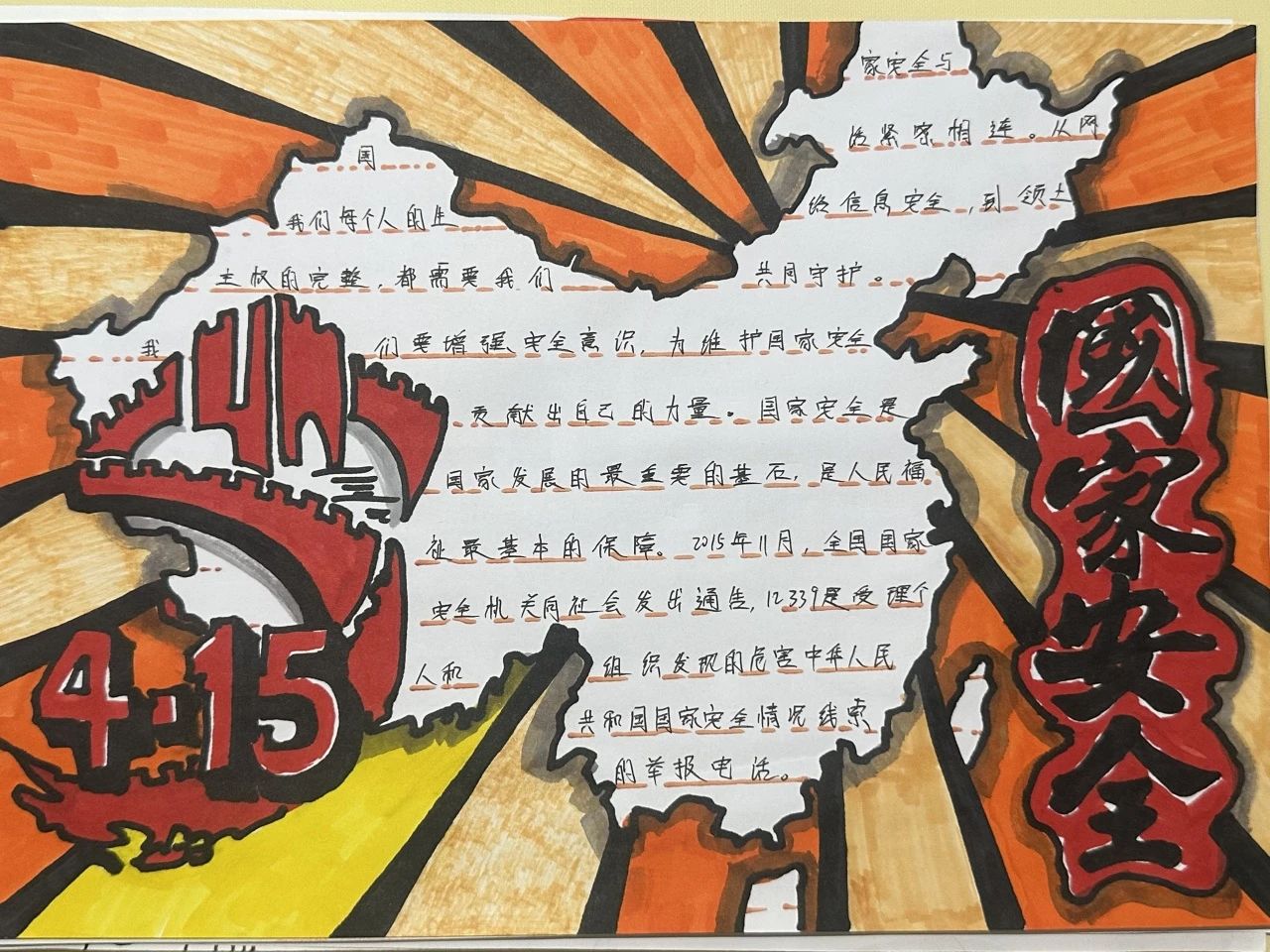 为深入贯彻总体国家安全观,切实增强青年学生的国家安全意识和责任担当,提升维护国家安全的能力素养,激发艺术创作活力。2025年4月14日至4月18日,艺术与教育学院开展了"国家安全,青春守护"主题手抄报创作活动。