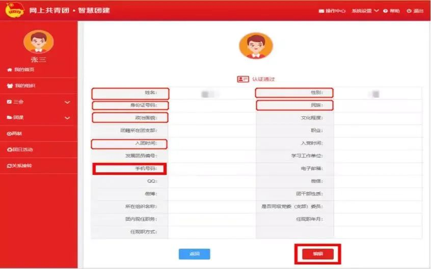 点击‘编辑’即可修改个人信息,红框为必填项,需填写新生本人常用手机号。