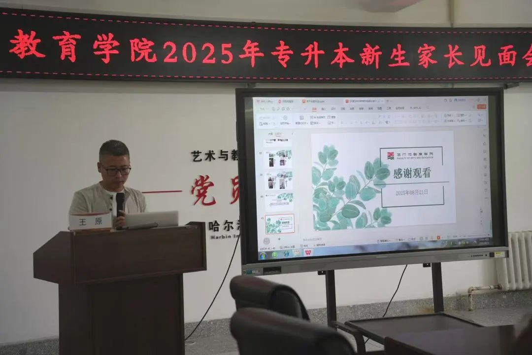 为深化家校共育机制,全面增进专升本新生家长对学院教育理念与培养模式的认知,构建家校协同育人共同体,营造全员参与、全程陪伴的成长支持环境。2025年8月21日,艺术与教育学院通过线上线下相结合的方式,召开了2025年专升本新生家长见面会。学院院长王伟建、党总支书记徐宏莉、副院长王原、副院长刘锡洋、党总支副书记兼2025级专升本辅导员徐靖宇及2025年专升本新生家长共同参会,会议由副院长王原主持。