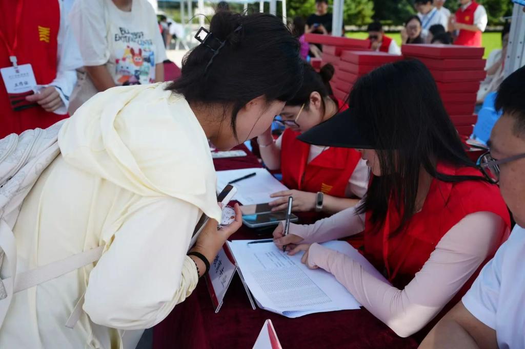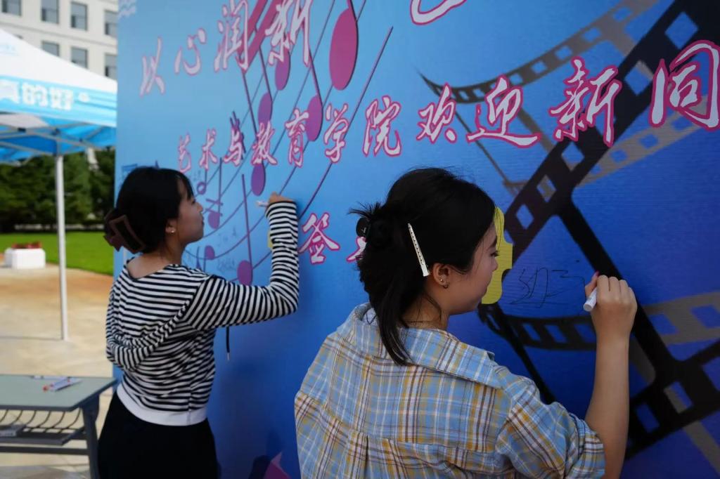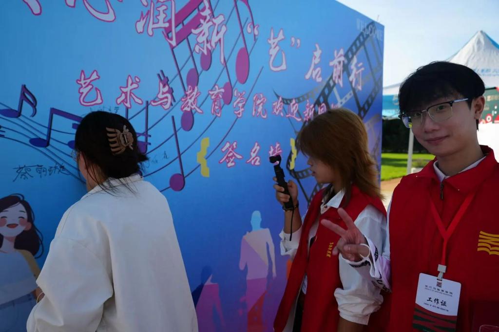 迎新现场各专业通过展板呈现学生优秀成果,音乐表演专业尹天野老师携学生以专业技艺展现教学特色,深化家长对学科发展的认知。同时,学院设立“以心润新‘艺’启前行”创意签名墙与合影区,新生与家长共同执笔书写未来期许,用镜头记录迈入大学的第一张笑脸;精心准备的“入学礼包”内含校园生活指南与学校三维展示图,既传递实用信息又承载殷切期望。