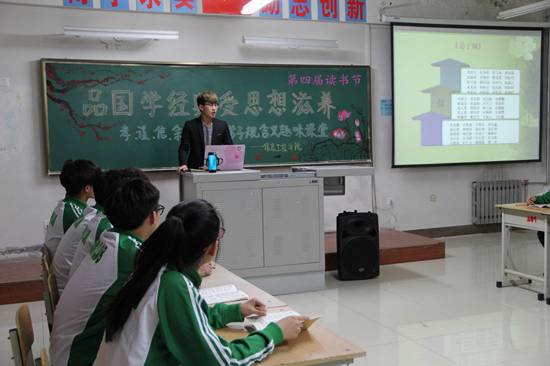 本次活动以第四届读书节“文明修身从读书开始”为主题,选取弟子规< 孝>< 谨>< 信>< 余力学文>四个篇章,为大家带来更深入的内容意思讲解,与以往的活动形式不同,此次活动以模拟课堂形式展开,并伴有同学们录制的视频来向大家展示弟子规的重要性。此次课堂的两位教师由学生扮演,为大家带来了一堂表演课,让大家更好的了解弟子规真正的内涵,做到了趣味性和学习的含义内容相结合,做到了寓教于乐,让大家通过不一样的方式再一次的认识了解了《弟子规》。