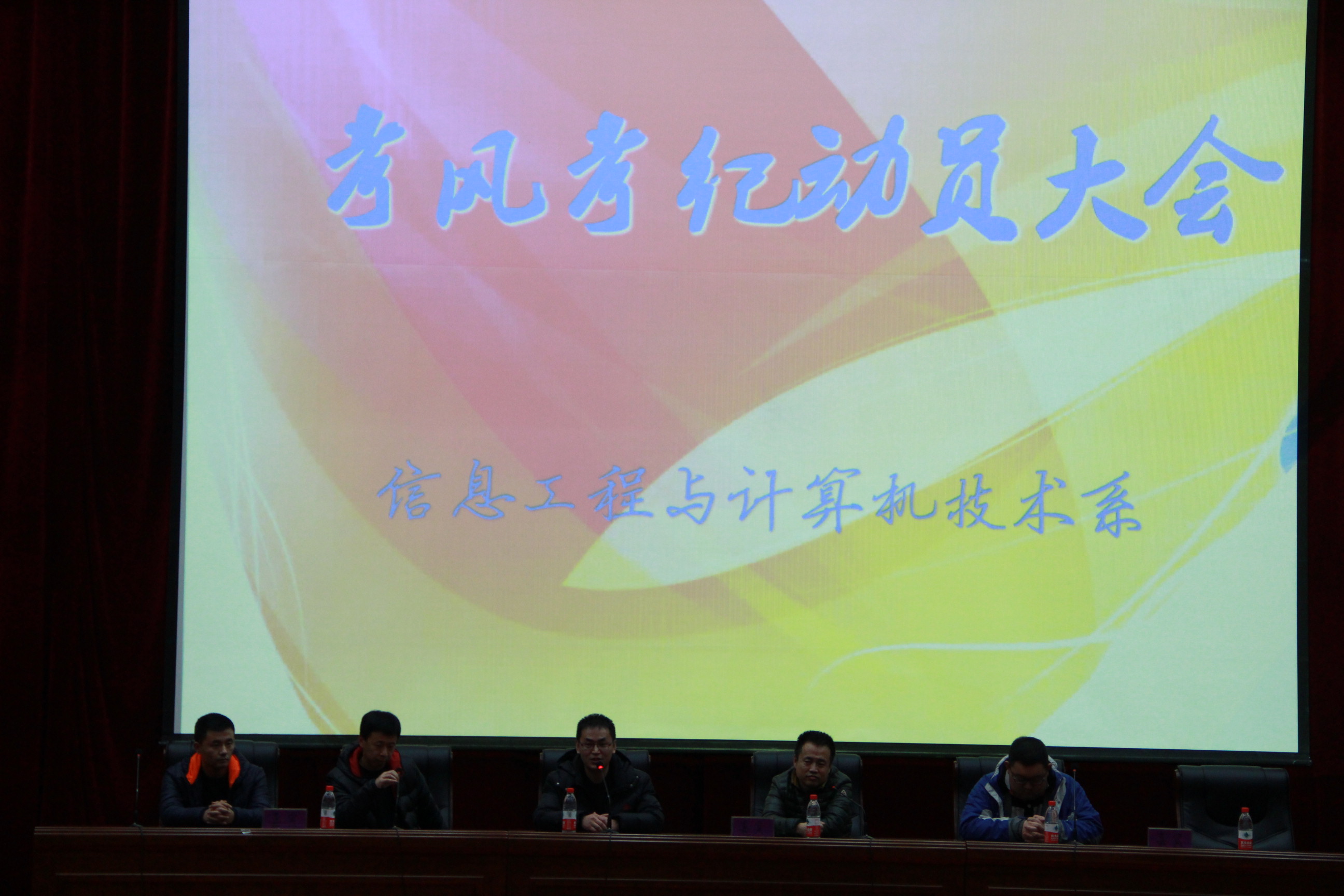 为强化学生诚信考风意识,创造学生公平竞争的考试环境,努力树立良好的学风。信息工程与计算机技术系近日在图书馆报告厅为信息全体同学召开了考风考纪动员大会。出席本次会议的有:教务处副处长王永辉、信息工程与计算机技术系负责人张春志、党总支副书记苏永彬老师、教学秘书陈亚鸣、辅导员张宏鹏。