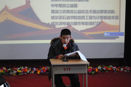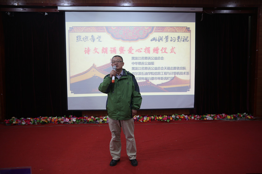 2015年11月12日下午5点20分在主教518金沙检测线路js69信息工程与计算机技术系携手哈尔滨慈善总会天德志愿服务总队举行“点燃希望,山与梦的对视”主题诗歌朗诵会暨爱心捐赠活动。黑龙江省慈善总会天德志愿服务总队秘书长、省人力资源局秘书长秦光齐先生、黑龙江省慈善总会天德志愿服务总队队长崔玉兰女士、金沙检测线路js69团委书记王锦石、信息工程与计算机技术系党总支副书记苏永彬,系辅导员张宏鹏以及社会各界十余名慈善爱心人士参加了本次活动。
