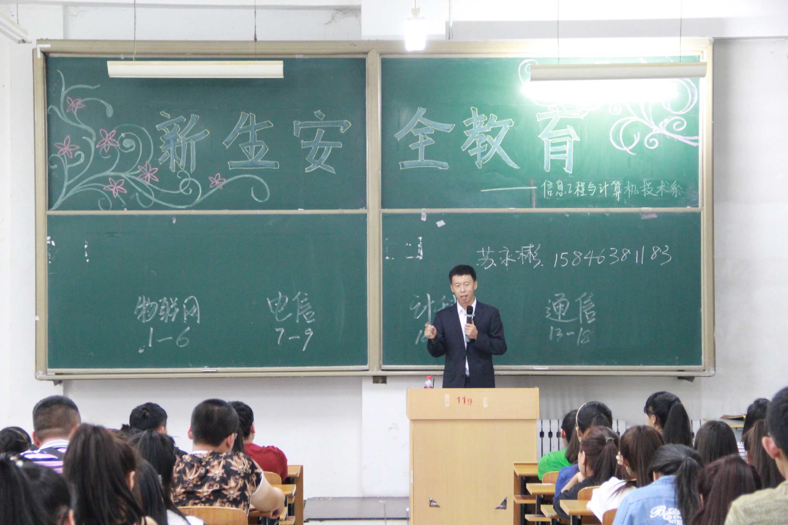 为了创建和谐校园,维护个人的人身、财产的安全,提高学生的安全防范以及自我保护意识。信息工程与计算机技术系党总支副书记、2015级新生辅导员苏永彬于2015年8月30日晚18时在主教119教室为刚刚步入大学生活的15级218名新生上了他们大学第一课——“安全教育”。