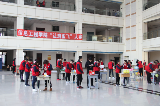 为丰富大学生课余生活,提高同学们的创新能力。信息工程学院于11月19日中午12时在主教阳光大厅成功开展“让鸡蛋飞”大赛。此次比赛邀请到的嘉宾有院辅导员黄家政及学生会主席团成员,全体18级同学观看本次大赛。本次大赛旨在培养同学们的创新精神,发掘同学们的动手实践能力。