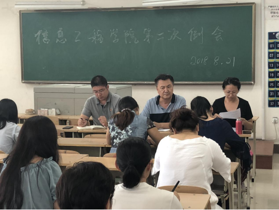 为进一步落实8月17日学校新学期工作会议精神,做好新学期的各项准备工作,2018年8月21日下午1点30分,信息工程学院于二教407召开新学期第二次工作例会。会议由院长胡文教授主持,学院班子成员及全体教工参加会议。