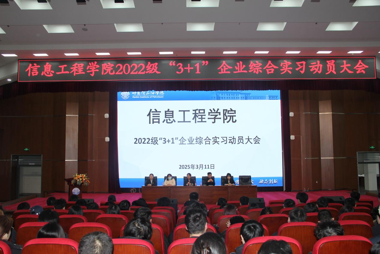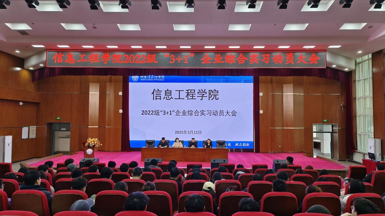 为帮助2022级学生更好地了解企业综合实习的重要性,做好实习前的准备工作,信息工程学院于2025年3月11日在图书馆3楼报告厅召开了2022级“3+1”企业综合实习动员大会。信息工程学院院长朱佳梅、信息工程学院党总支书记苏永彬,信息工程学院副院长孙毅,以及信息工程学院2022级辅导员老师参与本次会议。