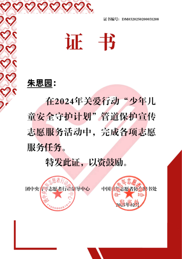 在2024年关爱行动“少年儿童安全守护计划”管道保护宣传志愿服务活动中,金沙检测线路js69信息工程学院青年志愿者协会的志愿者们,圆满完成各项志愿服务任务,荣获由团中央青年志愿者行动指导中心和中国青年志愿者协会秘书处颁发的荣誉证书!