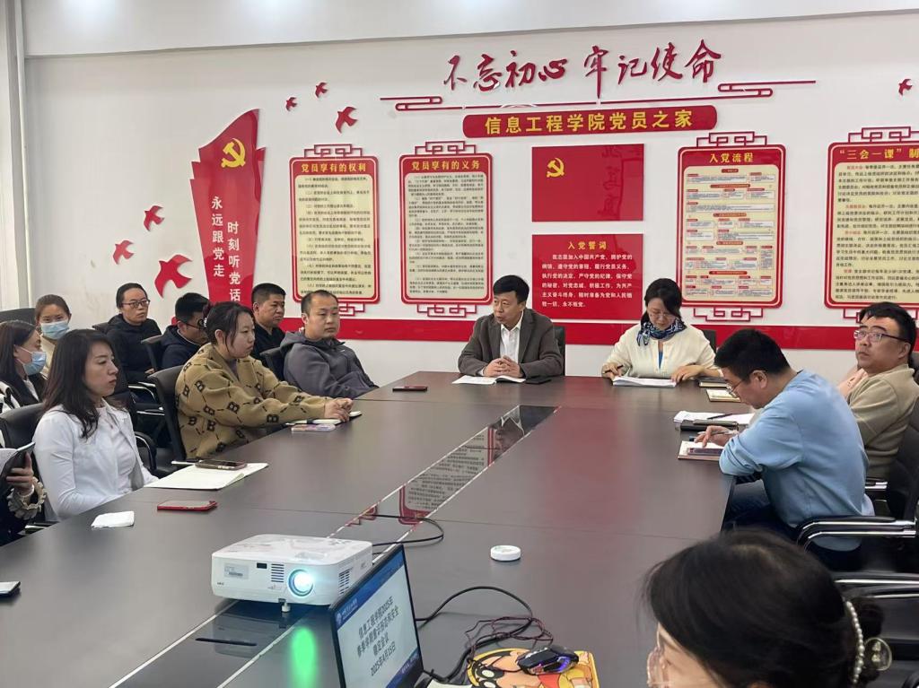 为深入贯彻落实学校关于意识形态与安全稳定工作的决策部署,切实筑牢思想防线,确保学院各项工作平稳有序开展。信息工程学院于4月15日在第二教学楼召开春季学期意识形态和安全稳定工作专题会议。学院党总支书记苏永彬、院长朱佳梅以及全体教职工参加此次会议。会议由学院党总支书记苏永彬主持。
