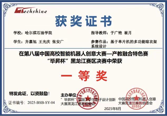 为在比赛中展现最佳水平,信息工程学院赛前精心部署,组建专项指导团队,由专业教师从方案设计、技术实现到现场答辩全程把关;参赛学生充分利用课余时间,反复打磨作品,攻克技术难点,在理论与实践的结合中不断优化设计。比赛现场,面对复杂任务与紧张赛程,哈石油电子信息工程专业学子沉着应对、协作高效,凭借稳定的技术表现与清晰的逻辑呈现,赢得评委一致认可。此次获奖作品聚焦智能控制、安防监测等实用领域,兼具创新性与应用价值: