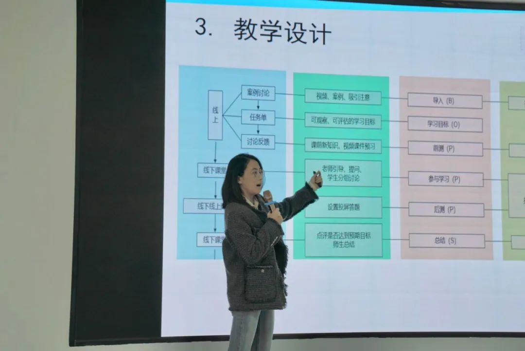 会上,共有9名教师进行设计分享,教师们以一节品牌课为例,从课程基本信息、教学设计、教学实施过程、教学反思四个方面展开详细介绍。教师们根据学生的实际特点,运用翻转课堂、小组讨论、案例实践等教学方法,恰当融入思政元素,用以满足不同学生的学习需求和兴趣。使学生更好地掌握课程的重难点,培养学生的实践动手能力、创新思维和团队合作能力。教学反思环节,教师们从教学效果、存在问题和改进措施入手,进行全面分析。与会教师就部分学生学习积极性不高,互动的程度不够等问题展开深入交流,现场气氛热烈,部分新入职青年教师表示受益颇多。