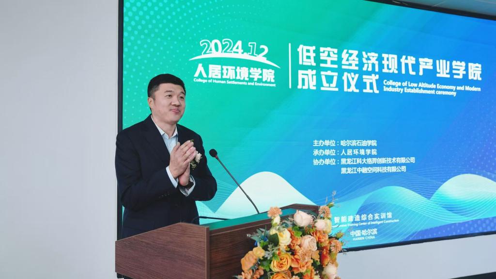 2024年12月18日上午,人居环境学院在智能建造综合实训管举行低空经济现代产业学院签约暨揭牌仪式。黑龙江科大格羿创新科技有限公司总经理杨格、黑龙江中融空间科技有限公司总经理白晓红等受邀出席。校长王义宁、副校长冯研、副校长康平军、教务处处长顾凤岐、人居环境学院院长盖晓连、党总支书记刘强及部分企业导师等出席及学院教职工代表等40余人参加。仪式由副校长冯研主持。