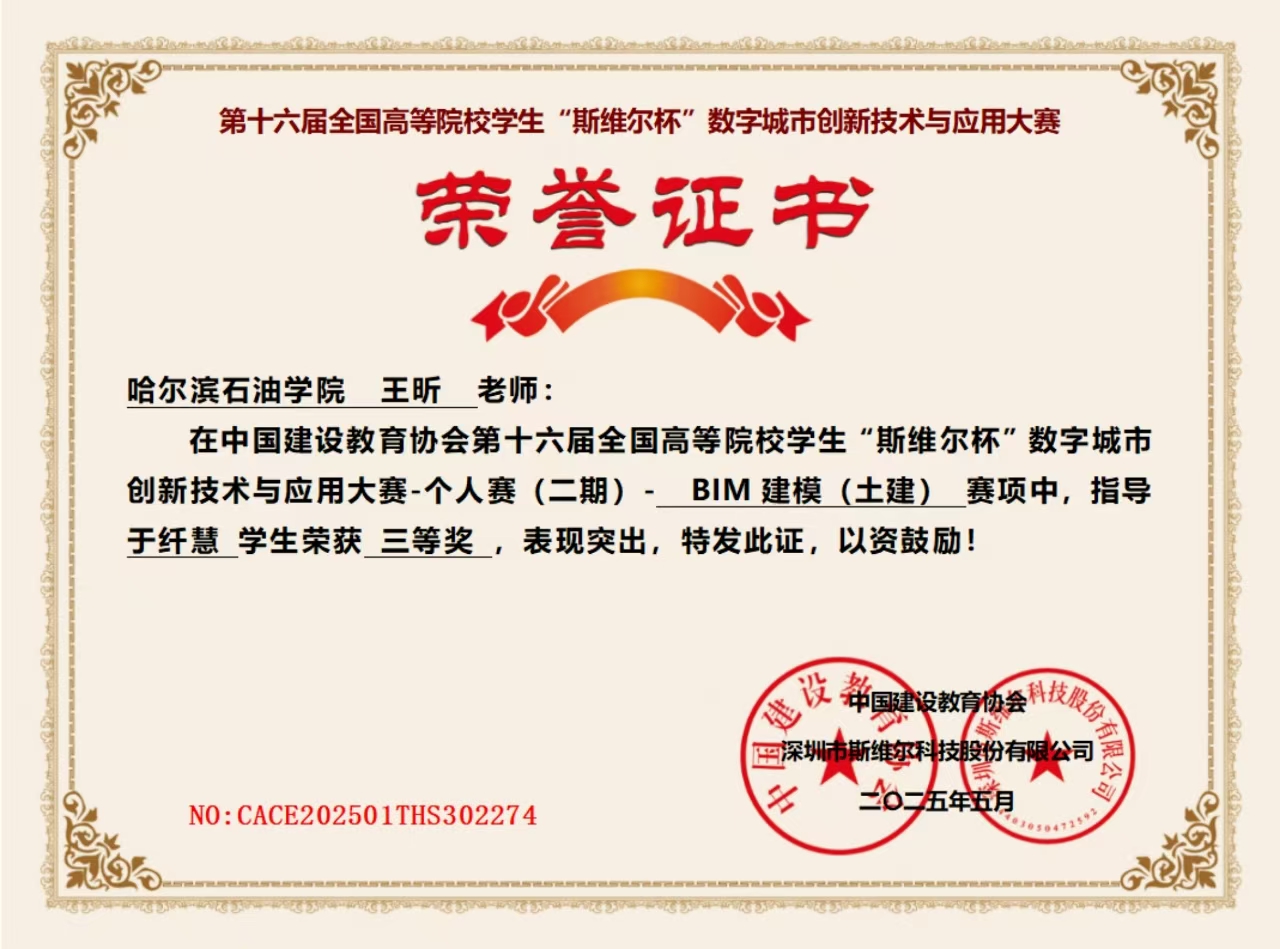 个人赛(二期)- BIM 建模(土建) 赛项中,王昕老师指导,于纤慧学生荣获三等奖