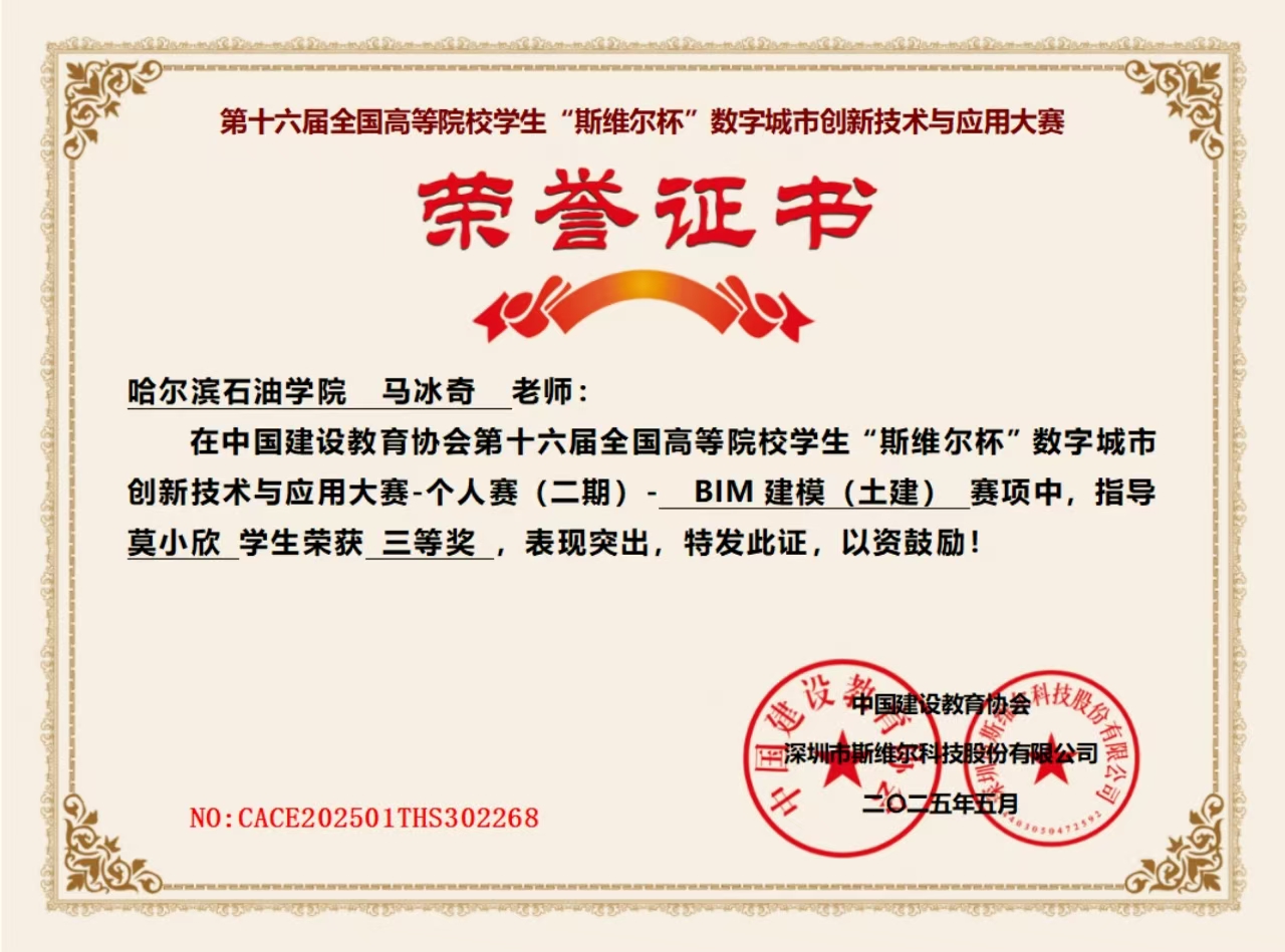 个人赛(二期)- BIM 建模(土建) 赛项中,马冰奇老师指导,莫小欣学生荣获三等奖