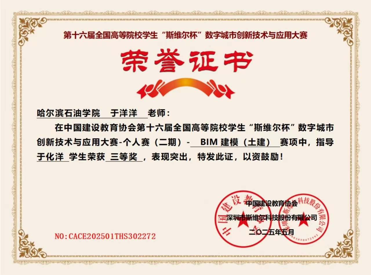 个人赛(二期)- BIM 建模(土建) 赛项中,于洋洋老师指导,于化洋学生荣获三等奖
