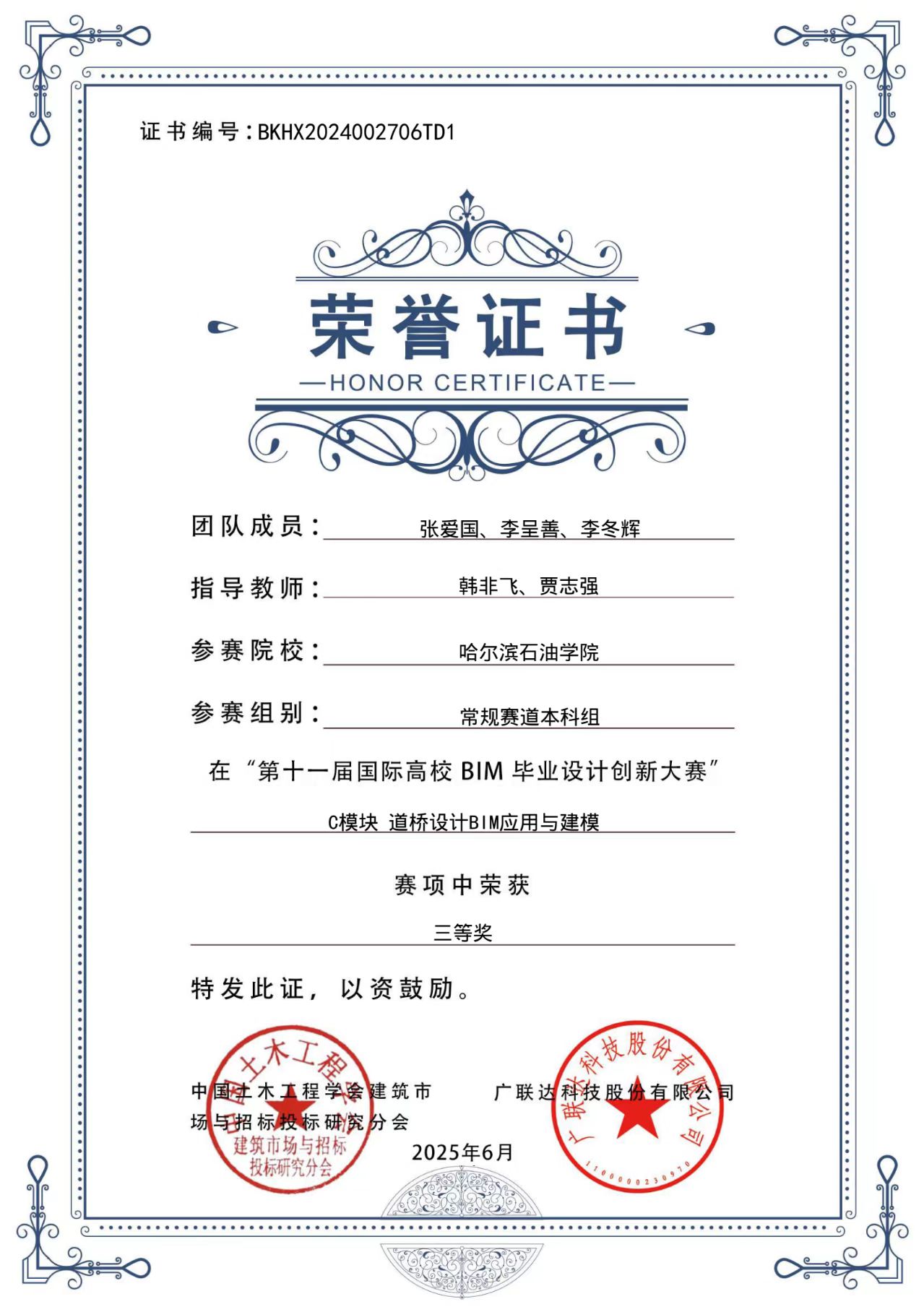 “第十一届国际高校BIM毕业设计创新大赛”荣获C模块 道桥设计BIM应用与建模三等奖