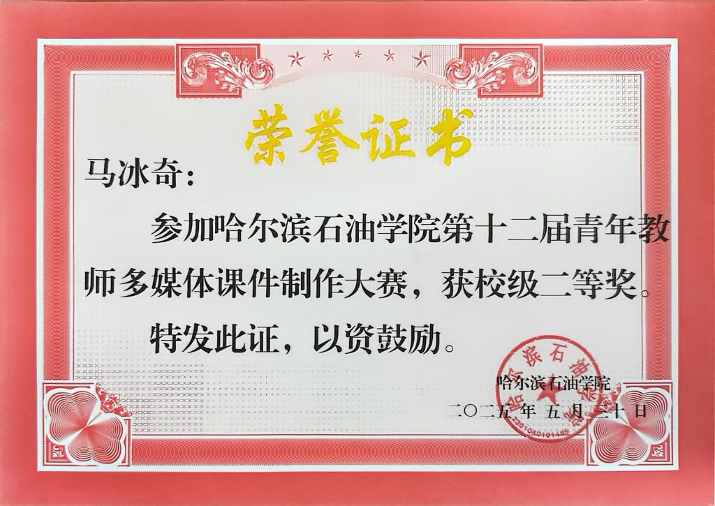 马冰奇老师荣获金沙检测线路js69第十二届青年教师多媒体课件制作大赛二等奖