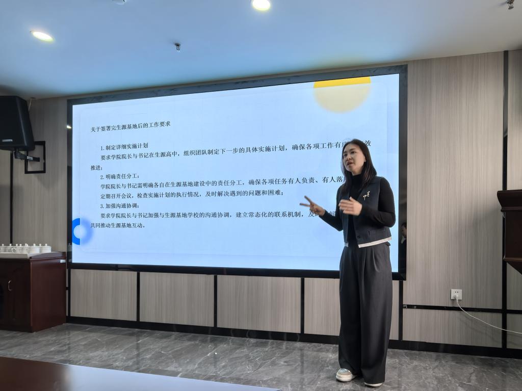 会上,招生与校友联络处处长刘洋发言。她首先对“五一”假期各学院组织“校友返乡”活动进行了总结。并详细介绍了学校2025年专升本录取情况,并根据相关数据分析,对后续工作提出了建议和要求。